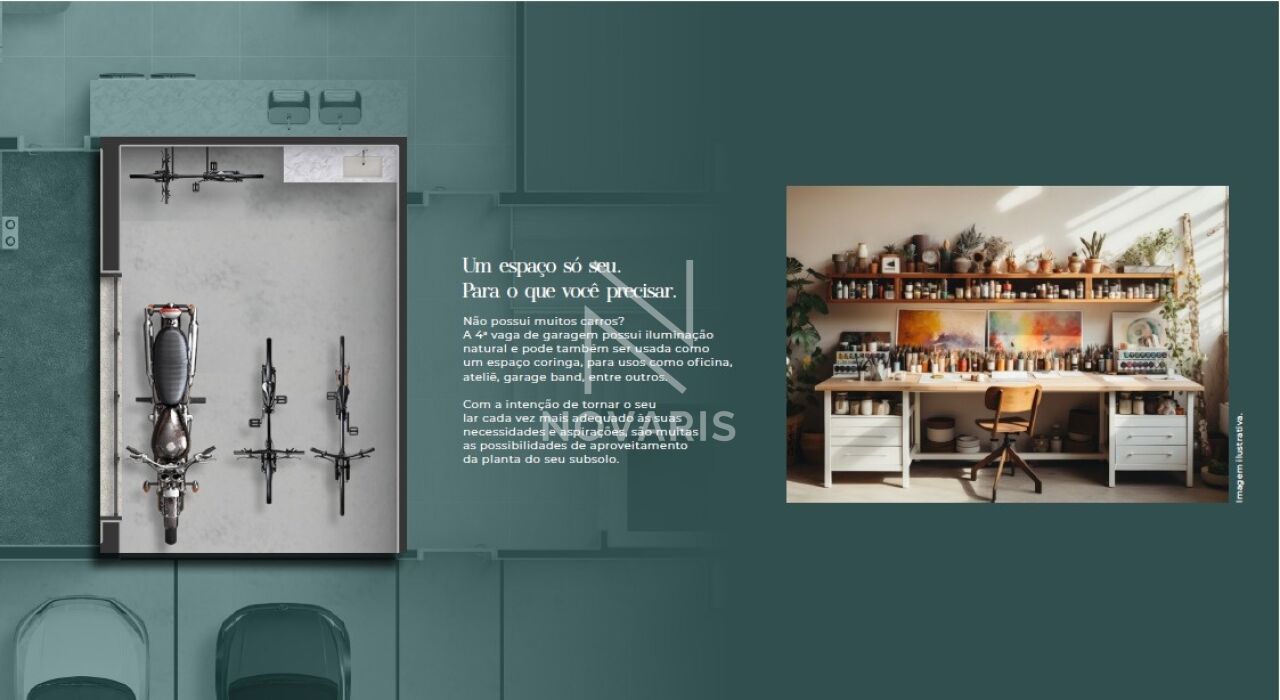 Subsolo com espaço multiuso (adega, ateliê, academia, estúdio ou oficina).